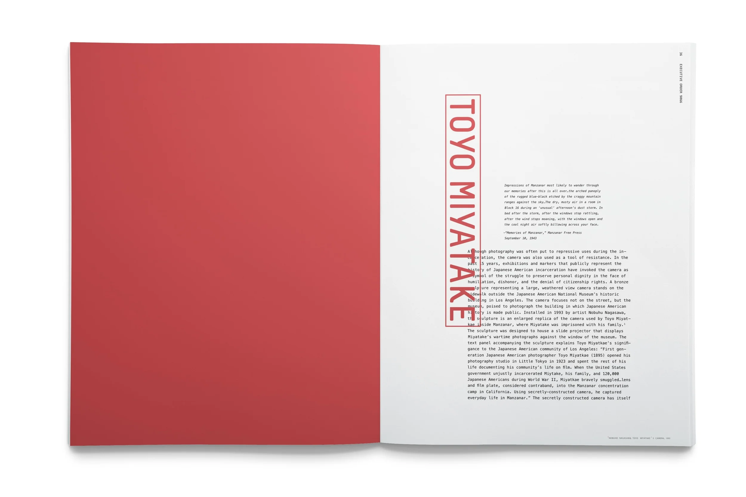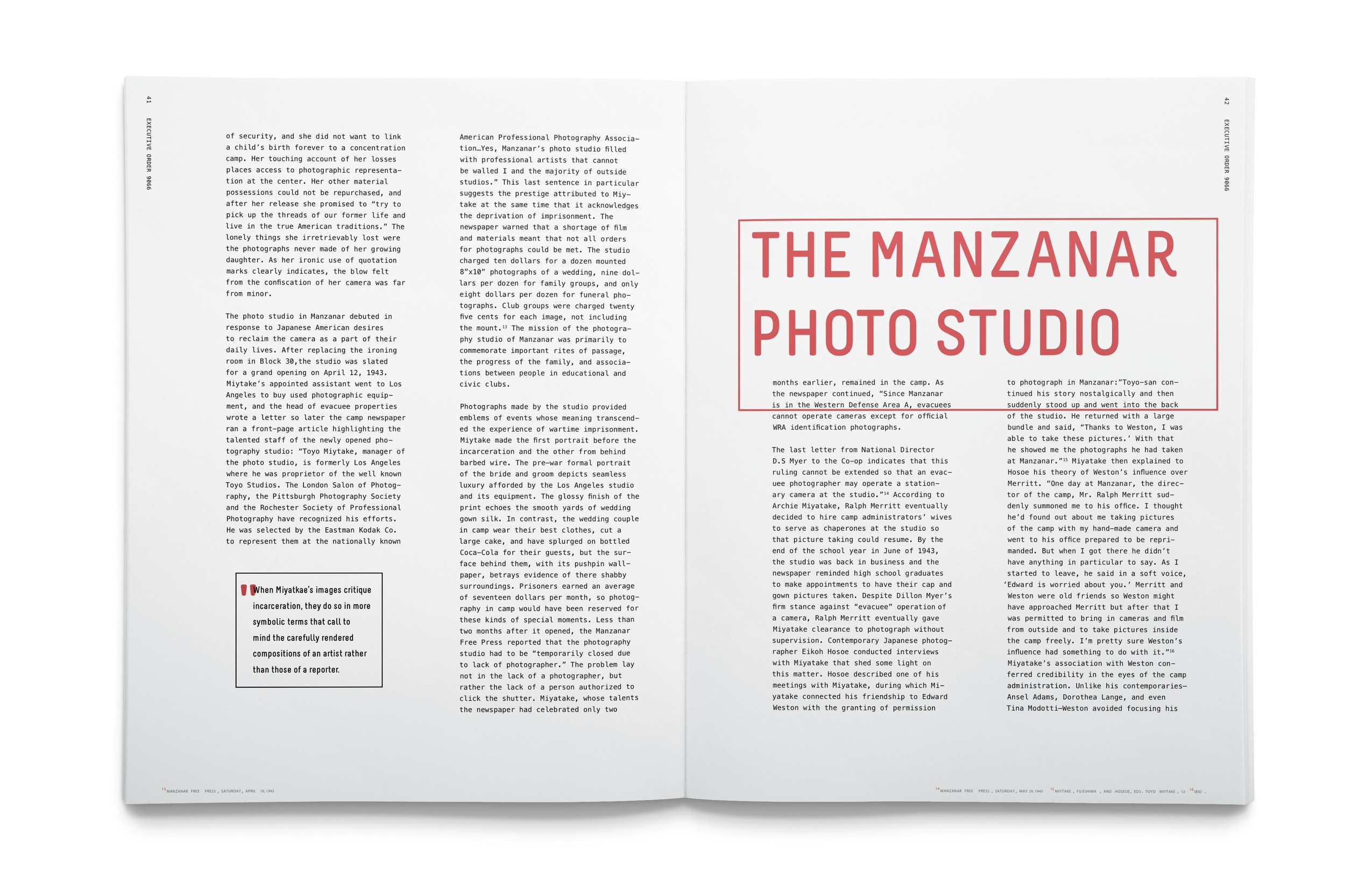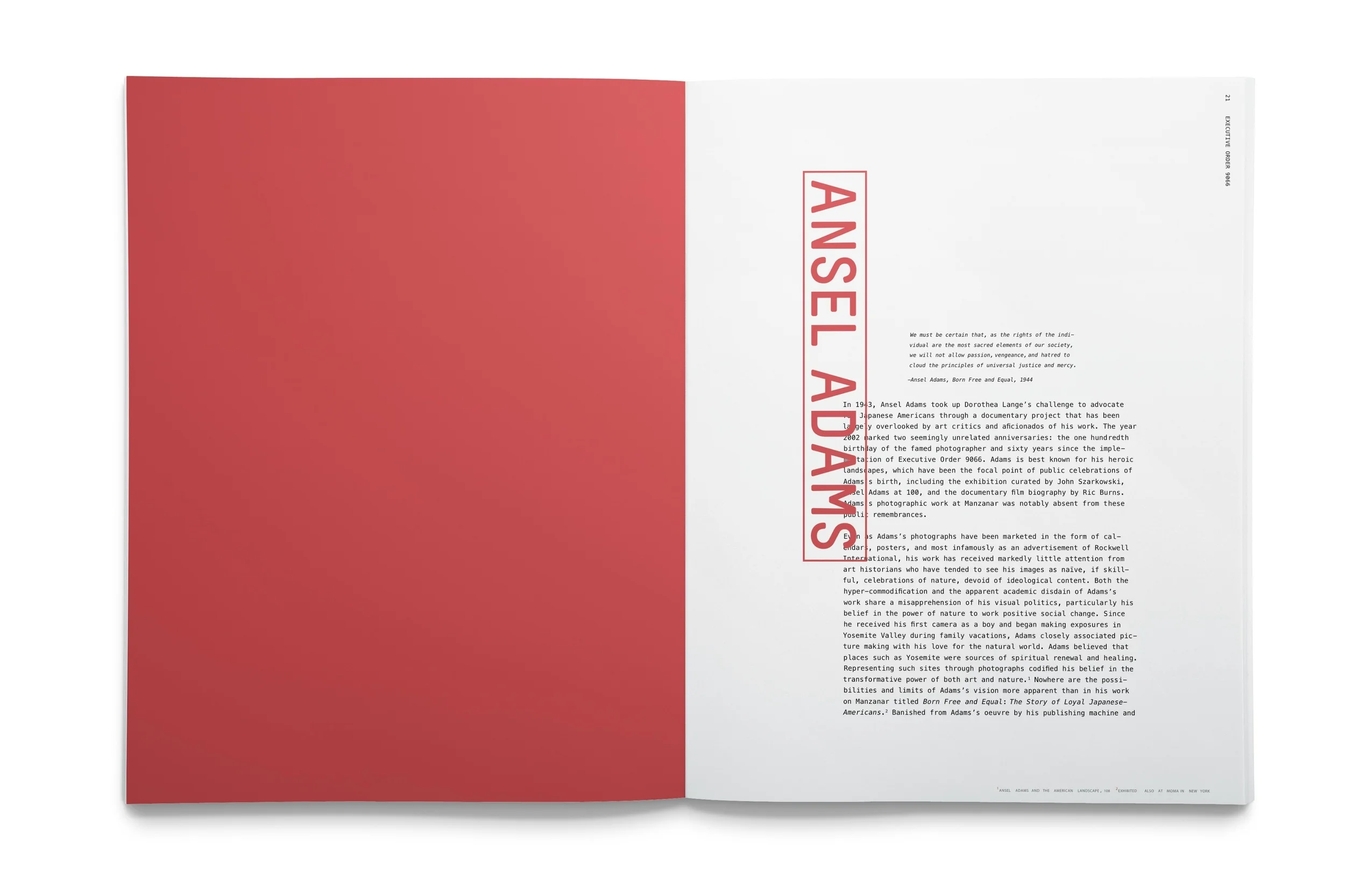 The documentary photography around the Manzanar Relocation Center creates a connection between U.S. history and contemporary issues involving visual images such as war, the aesthetic stance, and policy. Manzanar was photographed by Dorothea Lange, Ansel Adams, and Toyo Miyatake. All three documented the camp and its people, but each did so from a very different standpoint or motivation.